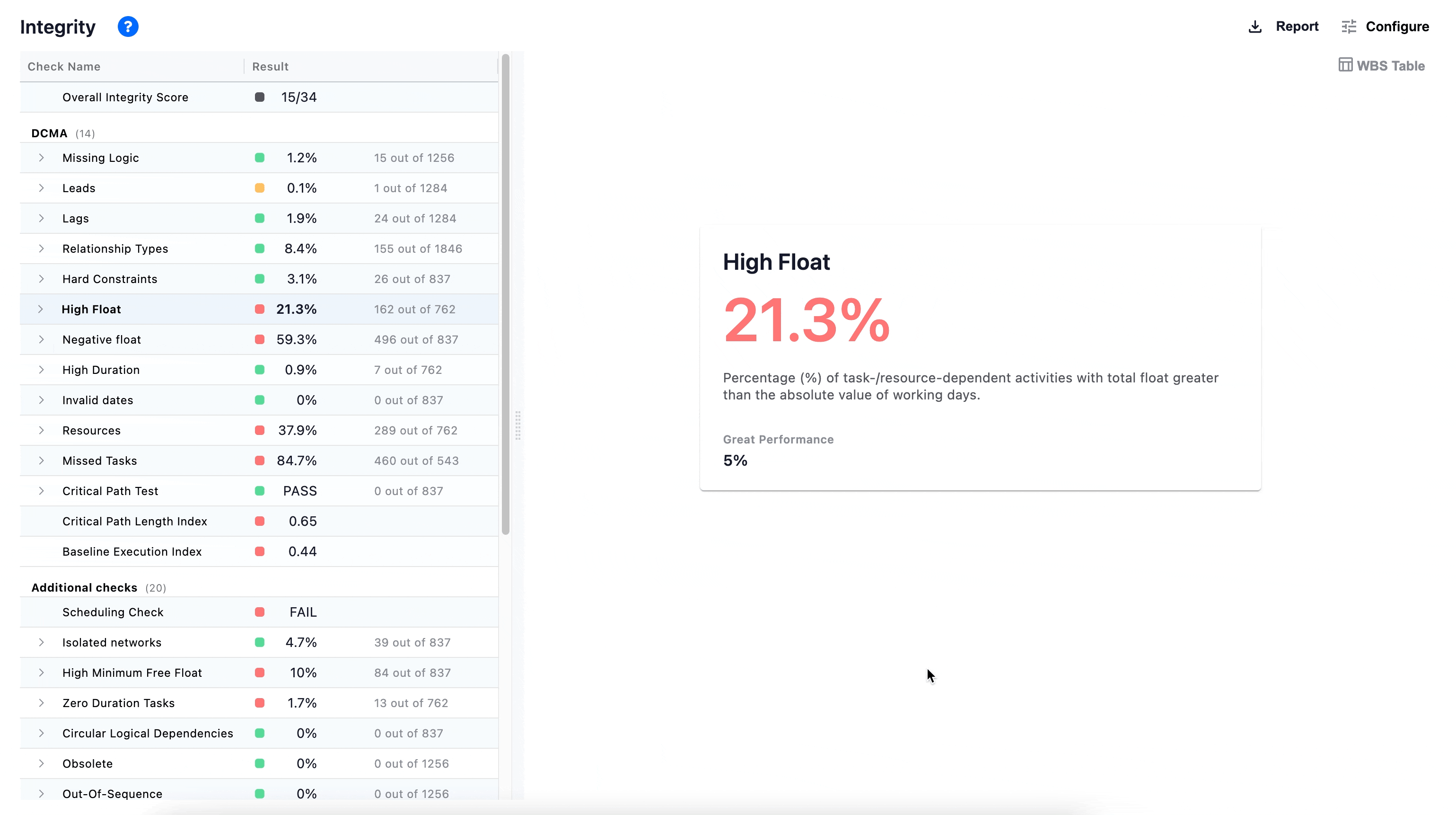 Go from a bird's eye view to individual activities fast. Just select the check and WBS that you care about, and a table will appear on the right-hand side, which includes all the activities that fail that particular check.