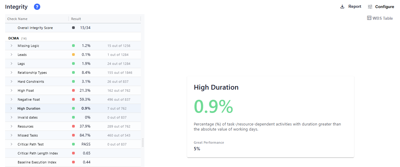 Using a simple color code (Green, Yellow, and Red), this screen allows you to assess your schedule quality on different WBS levels.