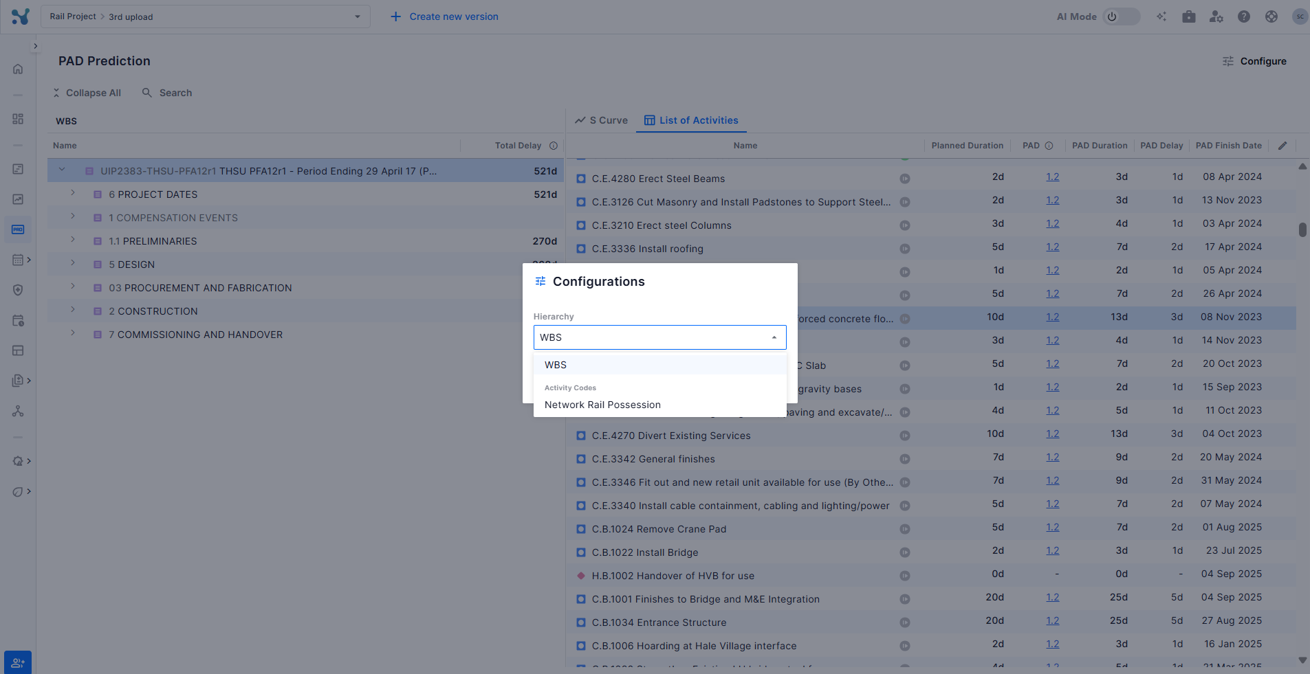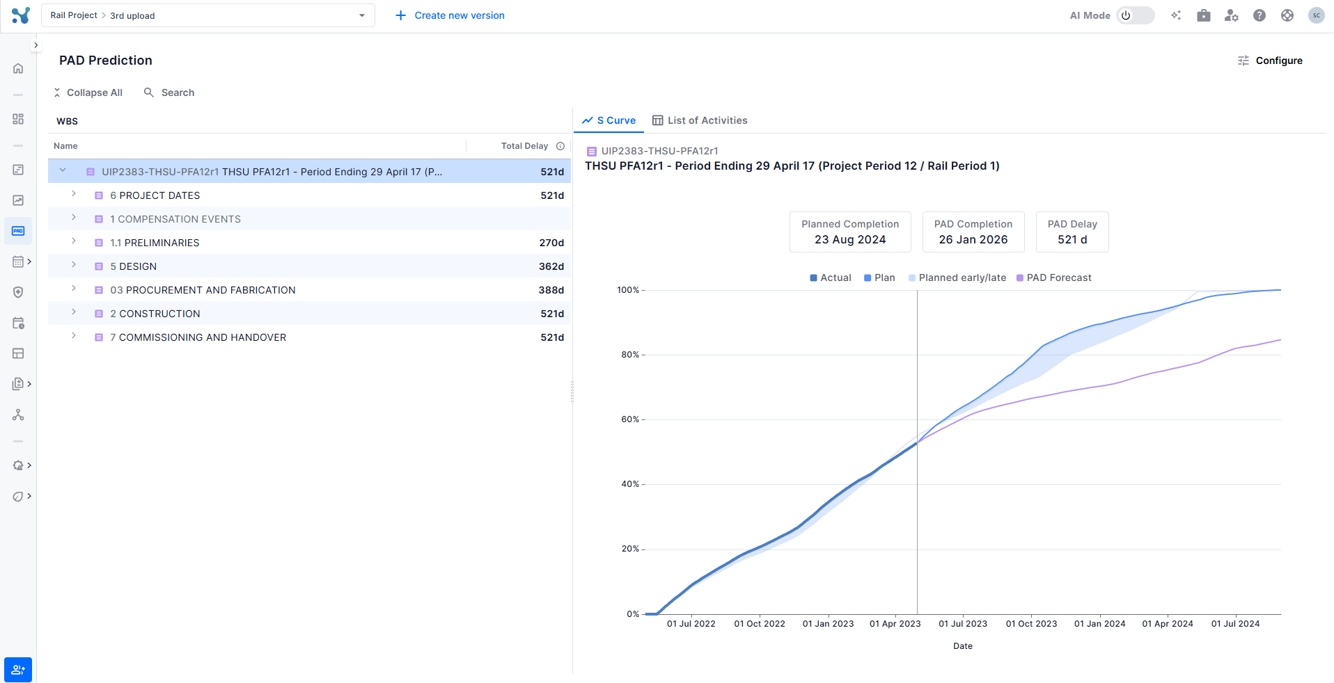 The List of Activities tab, accessible next to the S Curve tab, shows every activity under the selected WBS node alongside its PAD data. This detailed view lets you pinpoint which specific activities are driving delay.