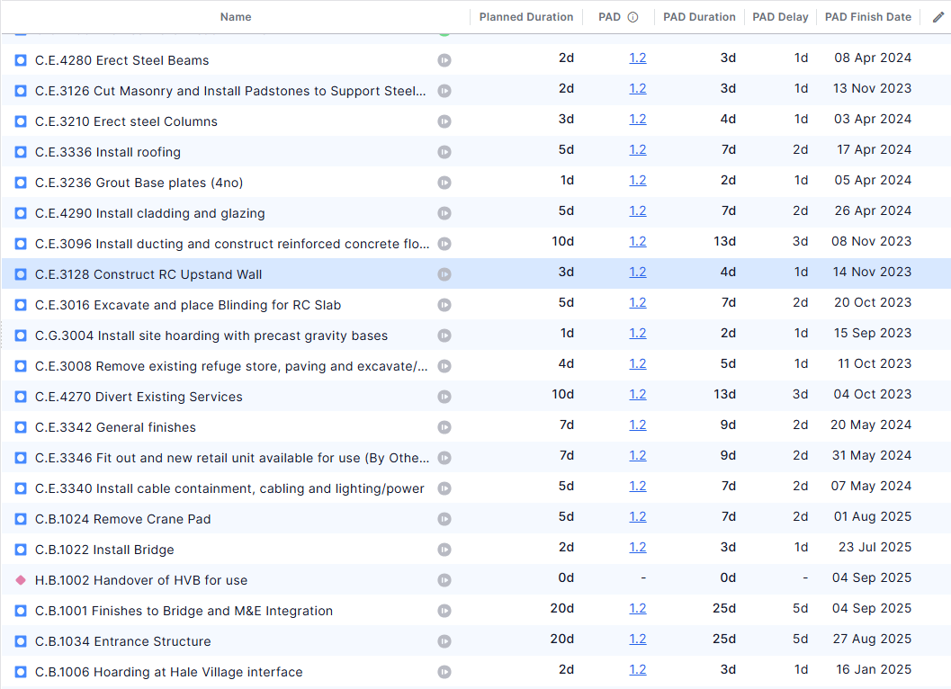 - Review individual activities with PAD, PAD Duration, PAD Delay, and PAD Finish Date
