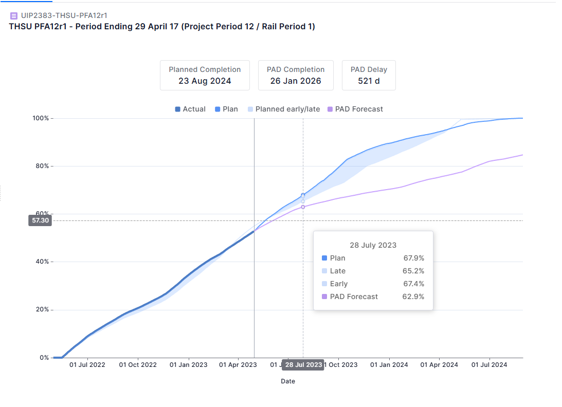 - Visualize the S Curve showing Actual, Plan, Early/Late, and PAD forecasted progress