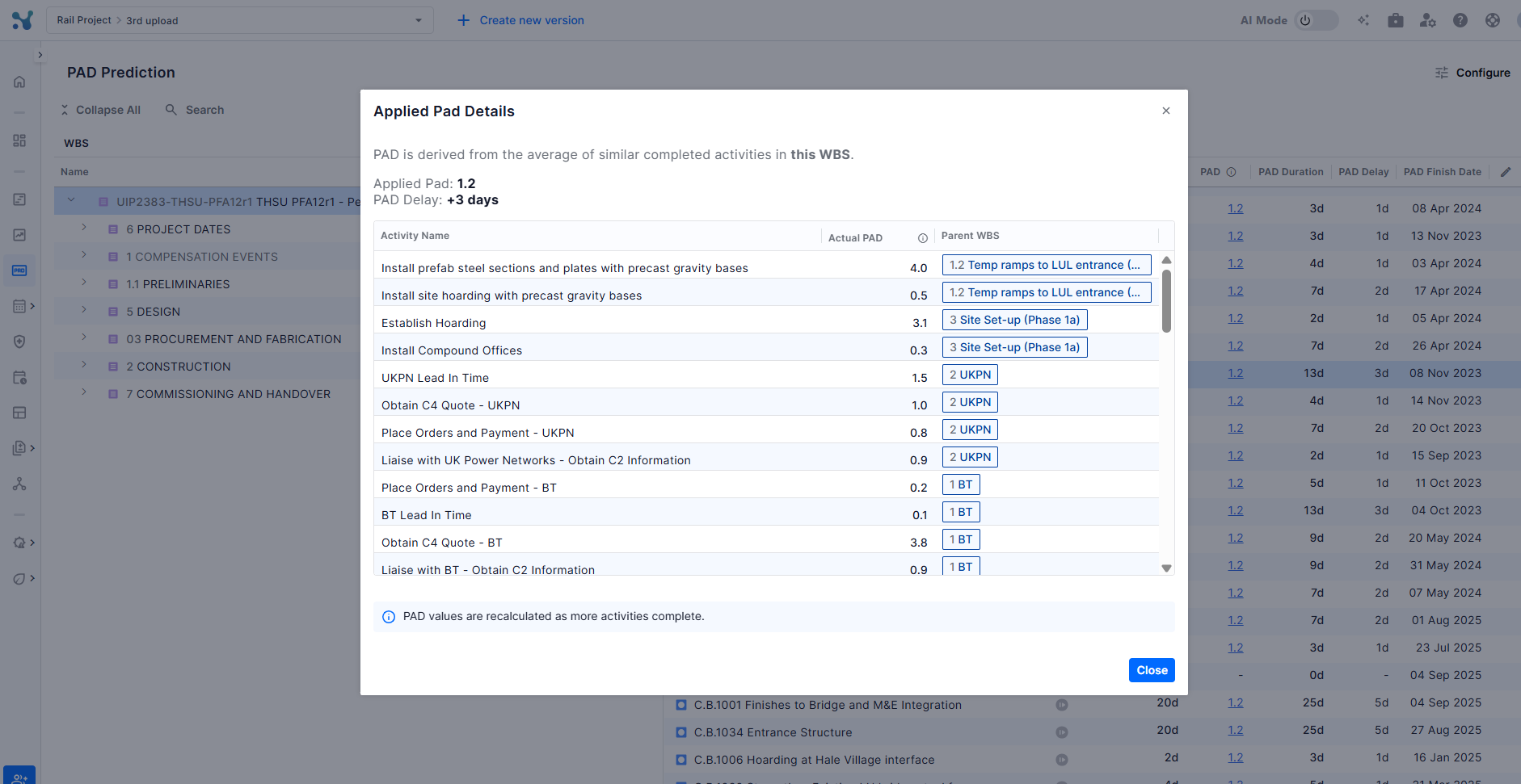 Clicking on any PAD value (shown as a blue hyperlink in the PAD column) opens the Applied PAD Details modal. The modal explains that PAD is derived from the average of similar completed activities in the selected WBS/ACS, showing which WBS/ACS level was used for the calculation, the completed activities included, and their individual Actual PAD values.