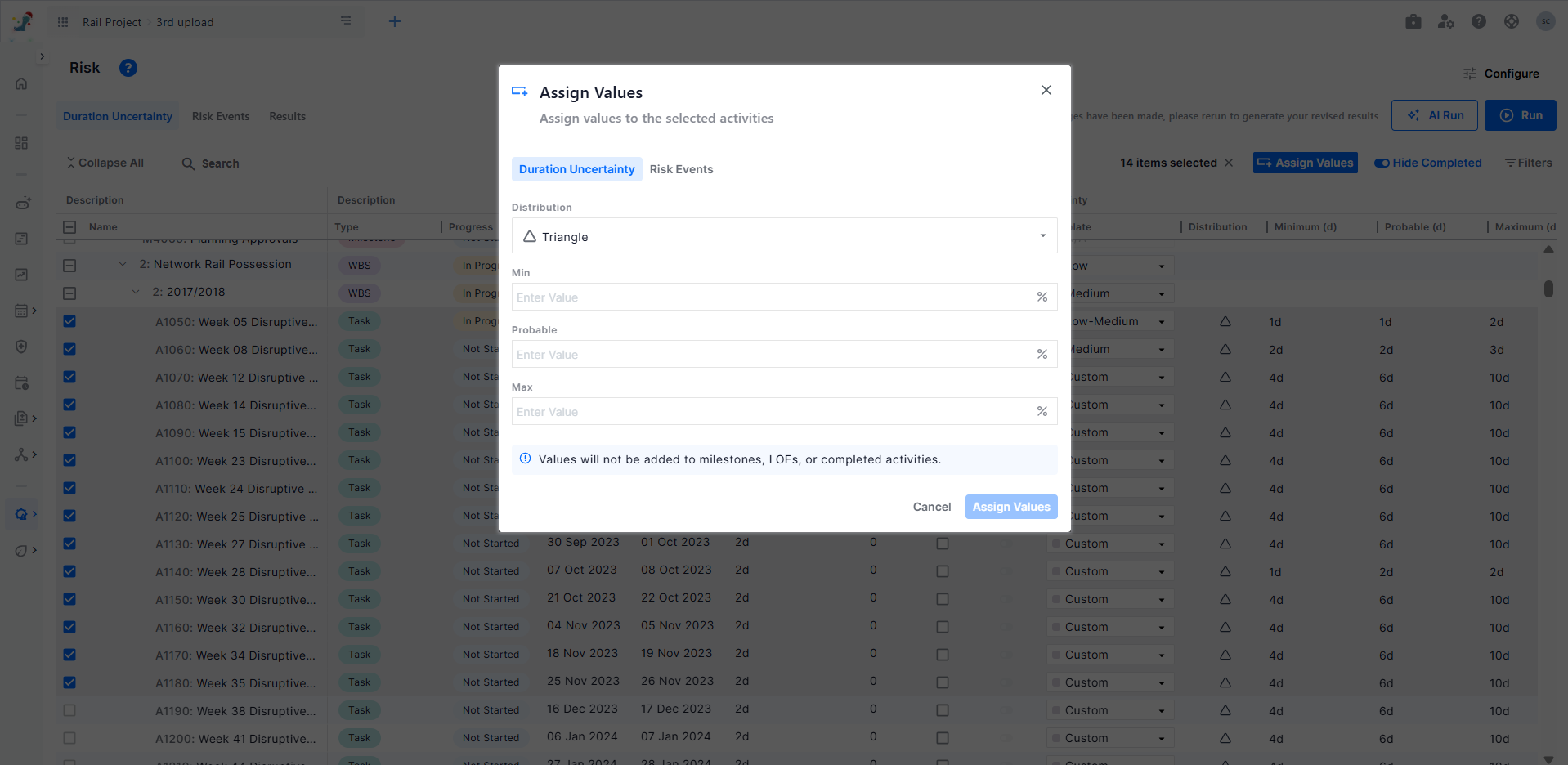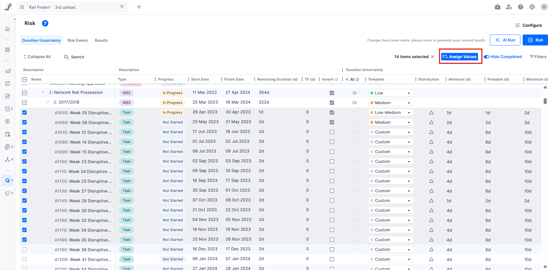 You can assign Duration Uncertainty or Risk Events to multiple activities at once using manual multi-selection. This capability works on both full table and filtered views. From the Risk screen, select multiple activities directly in the table. Once multiple rows are selected, an Assign button appears, allowing you to apply risk configurations in one action.