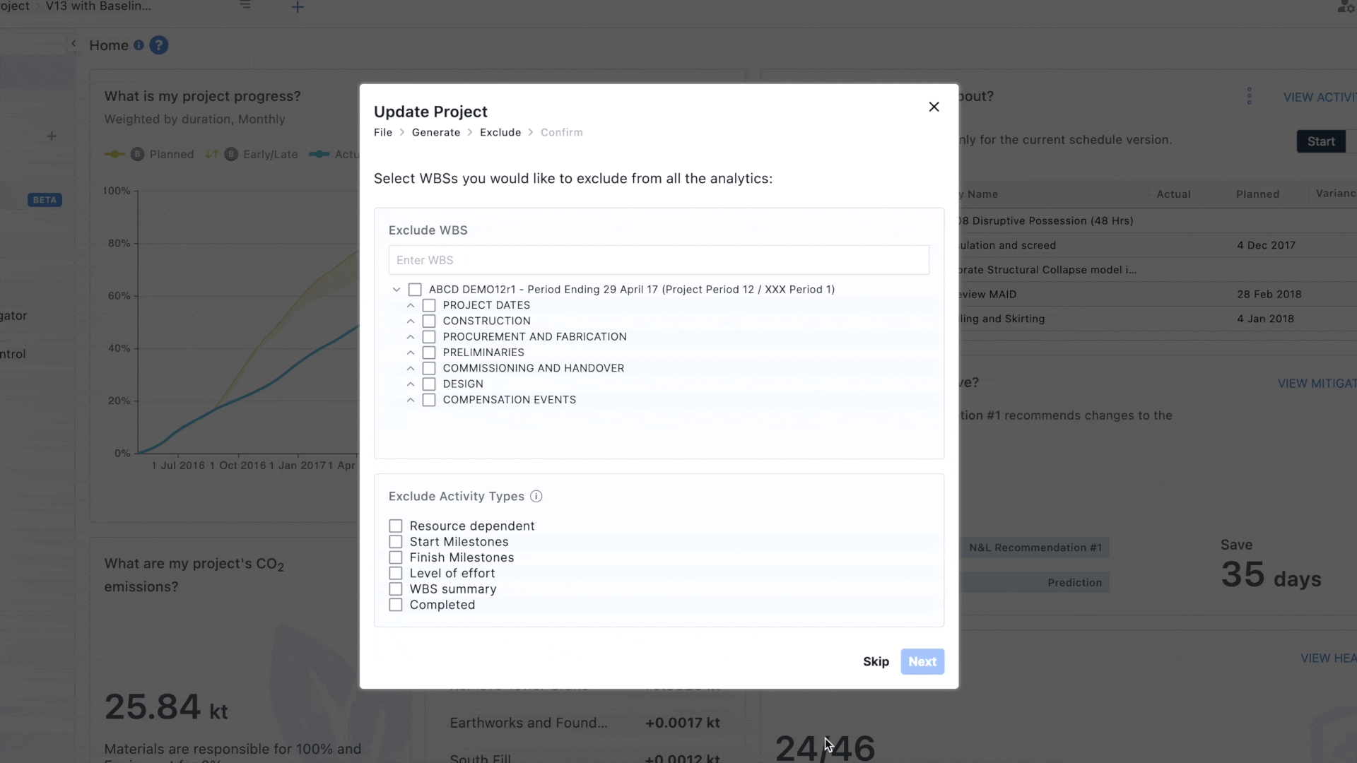 During the exclusion step one can drill down using the WBS navigation tree in order to find and select the appropriate WBS combination entailing al the activities that should be marked for exclusion. Additionally, if an activity type needs to be removed altogether , for example "completed" activities , then the activity type selection should be used to avoid a cumbersome WBS seek and find.