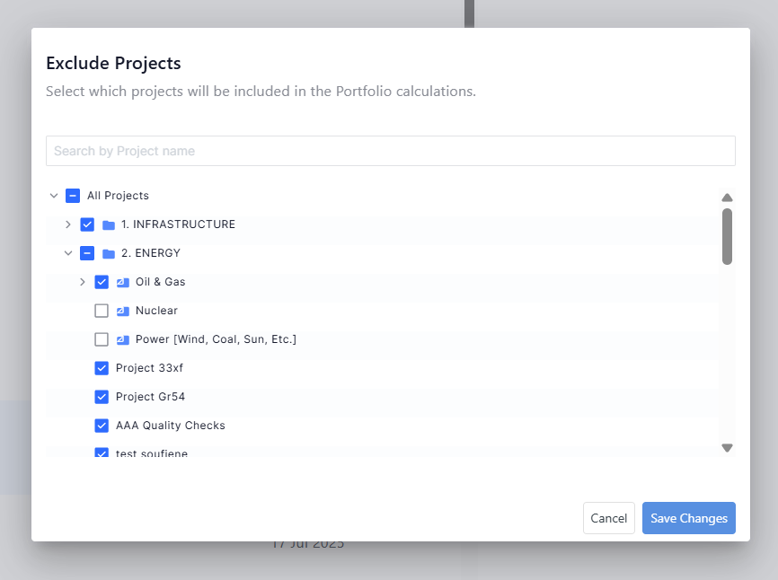 You can include or exclude portfolios, programs, projects, and project schedules from portfolio calculations.