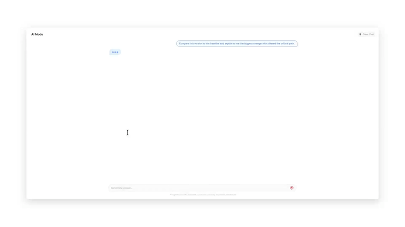 AI Mode builds on the expert foundations of Platform Mode, so answers stay auditable, trustworthy, and consistent with formal project controls practice. Enterprise data imports via API ensure this intelligence always works from current, complete project data without extra manual steps.