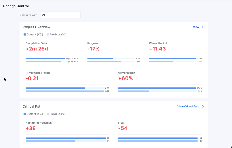 Change Control now highlights when constraints change, which is both highly impactful and difficult to spot in traditional tools like P6. Constraints are how managers say “this cannot move past this date”, and they are a common cause of negative float and unexpected behavior in the plan.