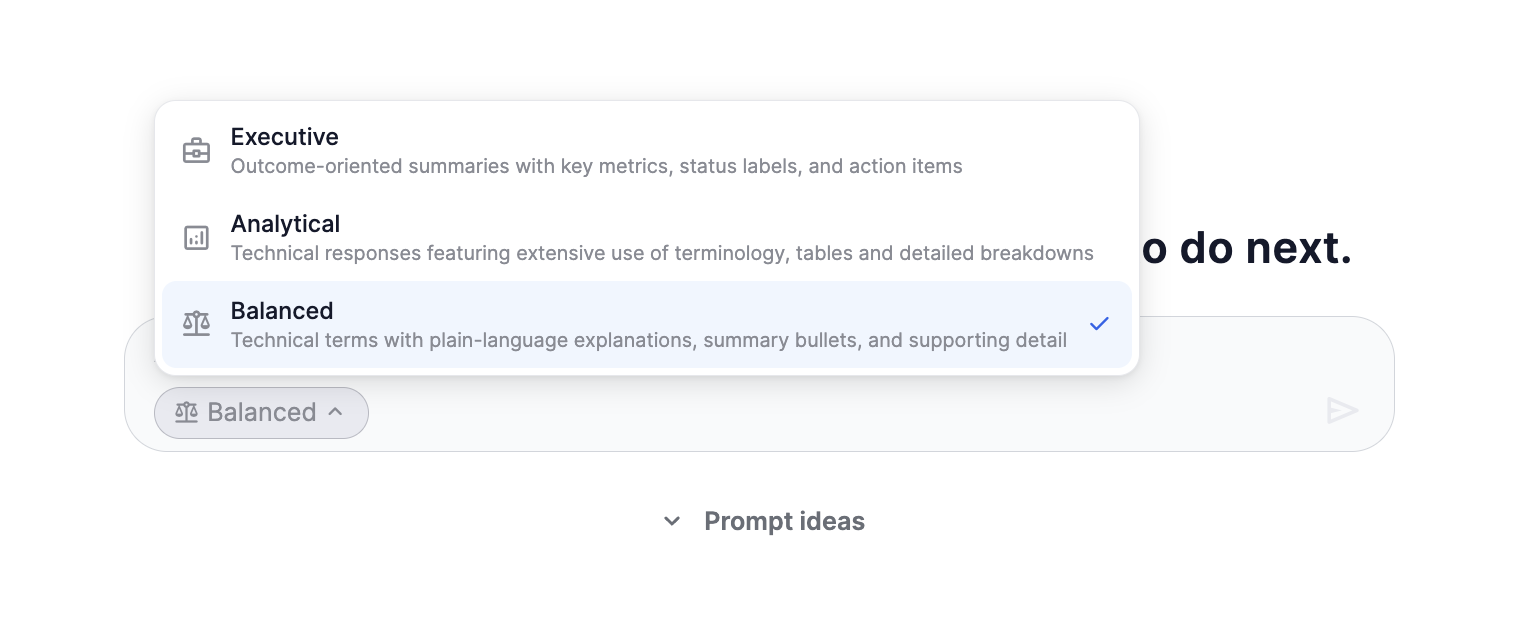AI answers can sometimes be longer than needed, especially when sharing with time‑poor stakeholders. You can now choose from three answer styles so the format matches the audience.