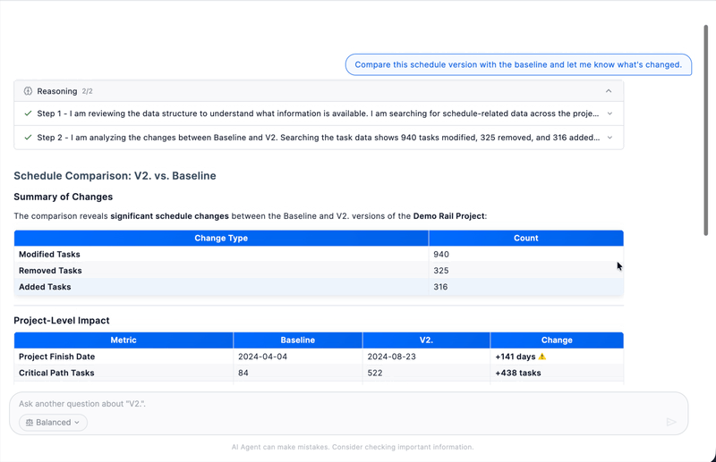 This release makes AI Mode easier to adopt day‑to‑day: users get guidance on what to ask, control over how answers are written, and simple ways to share outputs with others. At the same time, Timeline becomes a complete place to review and discuss schedules, with paths and drivers visible alongside the Gantt.