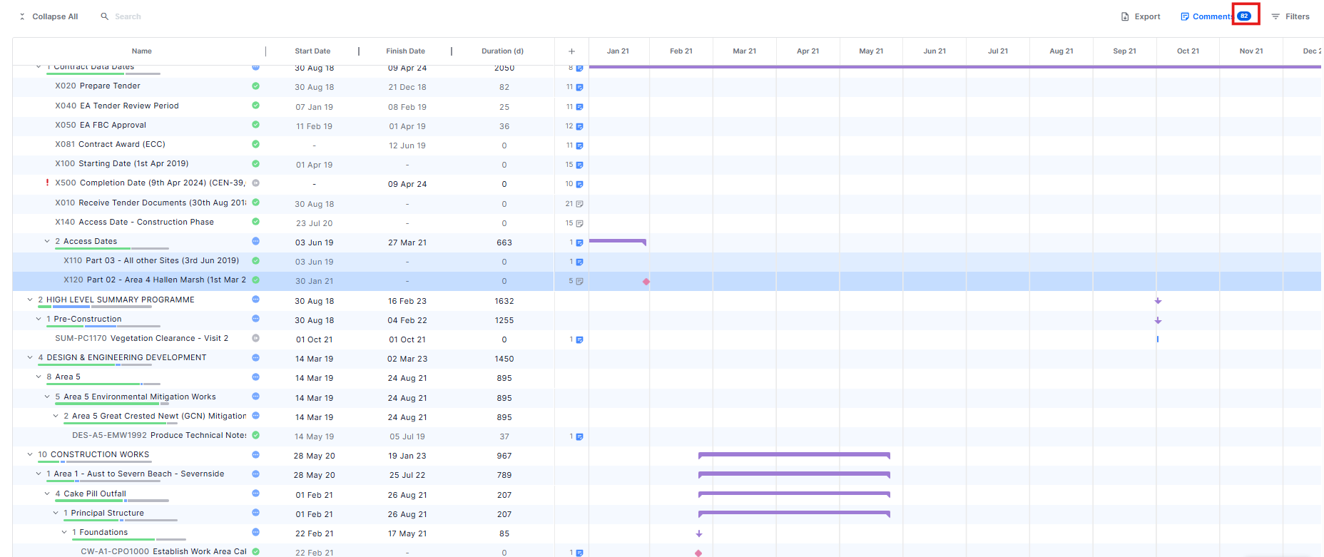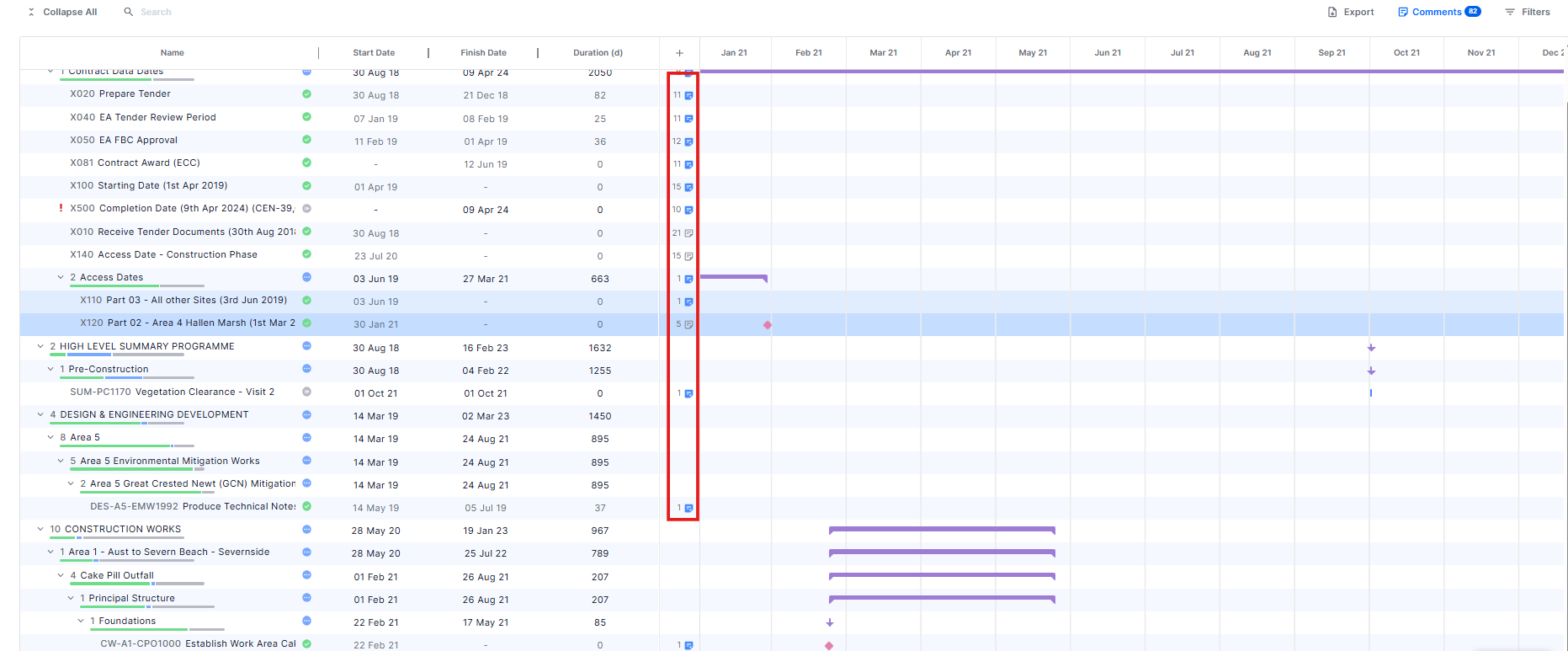 - The table displays the total number of comments for each WBS and activity.