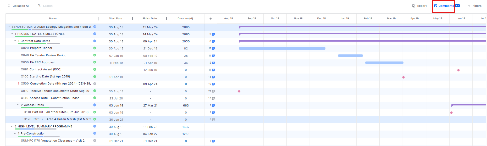 - Click the Comments button again to remove the filter and return to the full schedule view.