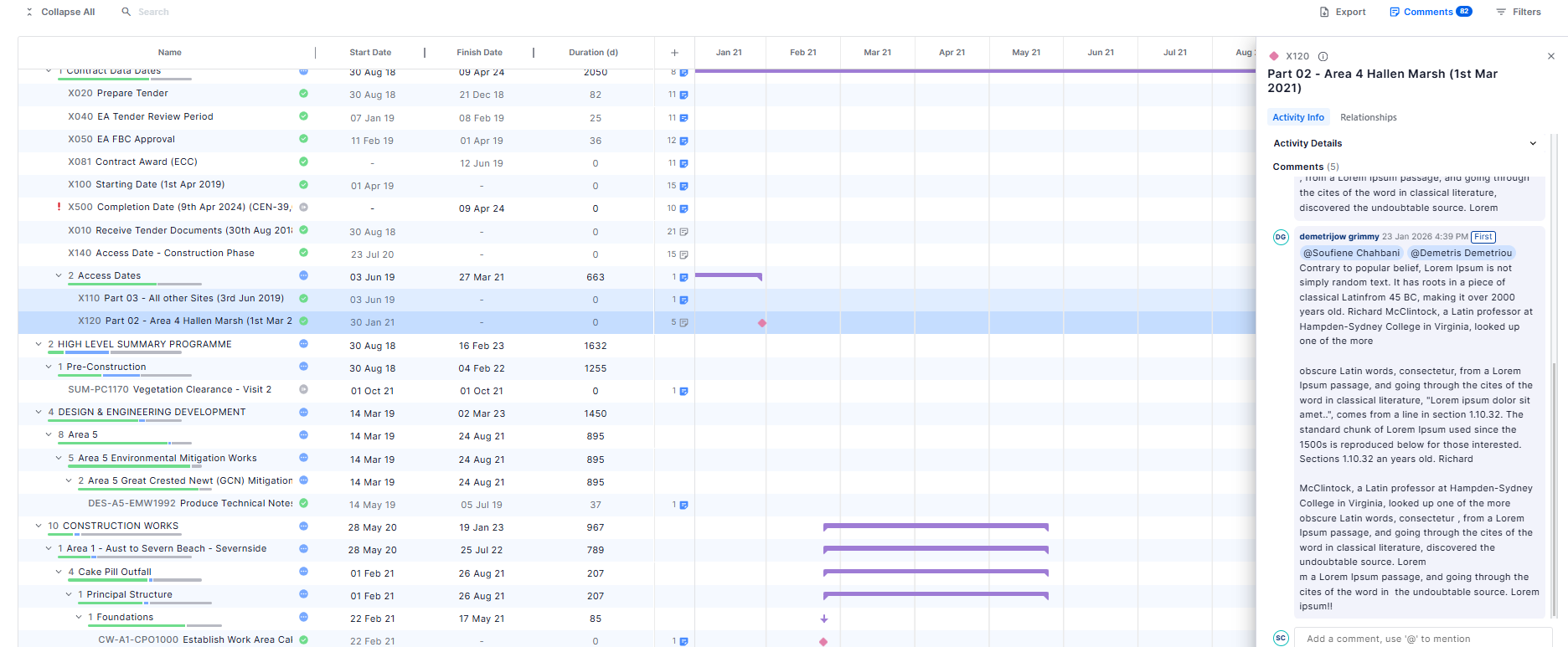 Comments persist across schedule updates, remaining linked to the selected activity or WBS and creating a living history of team collaboration. Even as new versions of the schedule are created, previous comments stay visible for reference.
